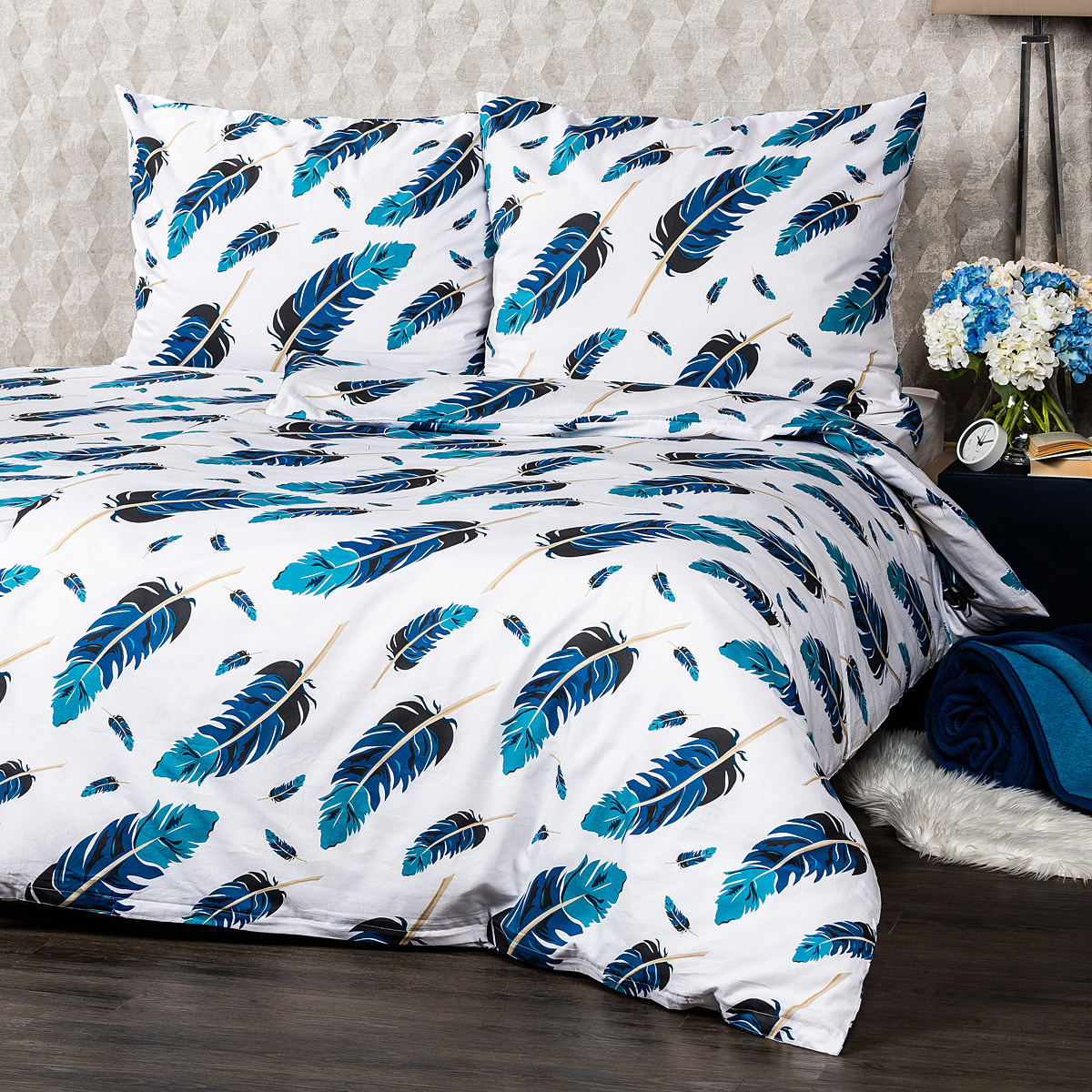 Jednoduché, elegantní, mystické. Jako pohlazením pírka vás ukolébá ke spánku originální bavlněné povlečení v uklidňující barevné kombinaci. Motiv peříček v modrých odstínech na kontrastním bílém podkladu působí jemně a vzdušně, dodá tak vaší ložnici jednoduchý a osobitý styl.Povlečení je vyrobené z kvalitní 100% bavlny, která zaručí příjemné usínání. Vzor je z obou stran stejný. Pohodlné zapínání na zip.Souprava obsahuje: 1x povlak na polštář 70 x 90 cm 1x povlak na přikrývku 140 x 200 cm