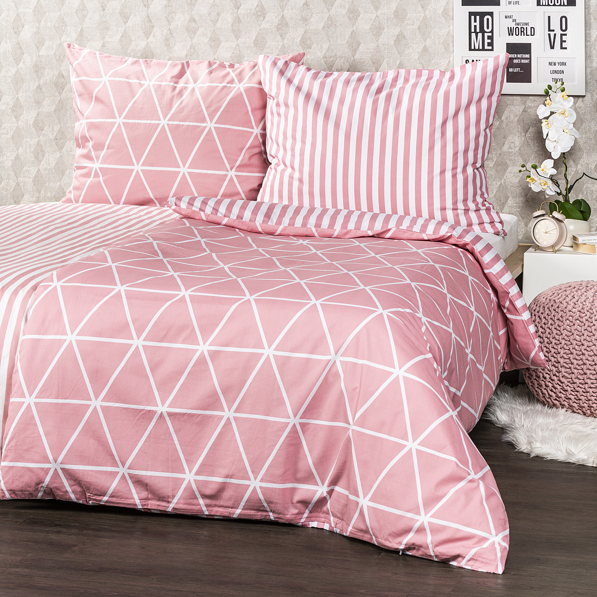 V jednoduchosti je krása a pro místnost sloužící k relaxaci to platí dvojnásob. Stylové bavlněné povlečení Galaxy potěší všechny milovníky jednoduchých vzorů. Uklidňující spojení růžové a bílé s čistými liniemi dodá vaší ložnici moderní a poutavý styl. Měkká a pohodlná 100% bavlna zajistí příjemný spánek. Povlečení je navíc oboustranné – z jedné strany klasické jemné proužky, z druhé jednoduchý geometrický vzor ve tvaru trojúhelníků – můžete ho tedy libovolně kombinovat a měnit svou postel každý den. Pro maximální pohodlí má povlečení praktické zapínání na zip.Souprava obsahuje: 1x povlak na polštář 70 x 90 cm 1x povlak na přikrývku 140 x 200 cm