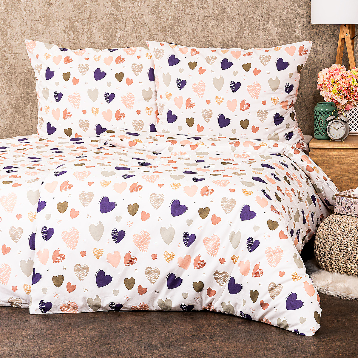 Bavlněné povlečení pro skvěle doladěnou ložnici v romantickém stylu. Zamilujte si spánek ještě víc! Bílý podklad s motivem srdíček v pastelových odstínech růžové, fialové a khaki působí elegantním dojmem a vytvoří tak jedinečnou atmosféru pro romantické snění.Příjemná 100% bavlna vám zajistí kvalitní a ničím nerušený spánek. Povlečení je z obou stran stejné a má praktické zapínání na zip.Souprava obsahuje: 1x povlak na polštář 70 x 90 cm 1x povlak na přikrývku 140 x 200 cm