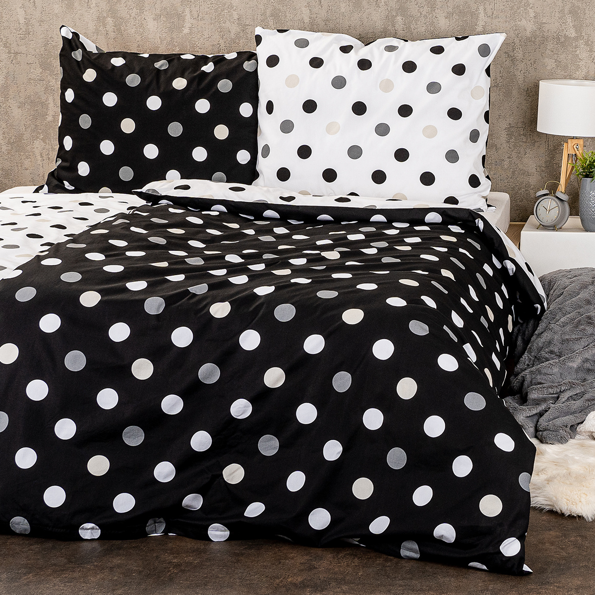 Oživte svou ložnici puntíky! Originální bavlněné povlečení v klasické černobílé barevnosti s šedými detaily vás zaujme svou jednoduchostí i rozvernou hravostí. Motiv puntíků dodá každému interiéru jedinečný styl a rozhodně nesmí chybět ve výbavě žádného milovníka retro elegance. Kvalitní 100% bavlna zaručí maximální pohodlí během spánku.Povlečení je oboustranné – z jedné strany puntíky na černé, z druhé strany na bílé. Můžete ho tedy libovolně kombinovat a měnit svou postel každý den. Pro maximální pohodlí má povlečení praktické zapínání na zip. Souprava obsahuje: 1x povlak na polštář 70 x 80 cm 1x povlak na přikrývku 160 x 200 cm