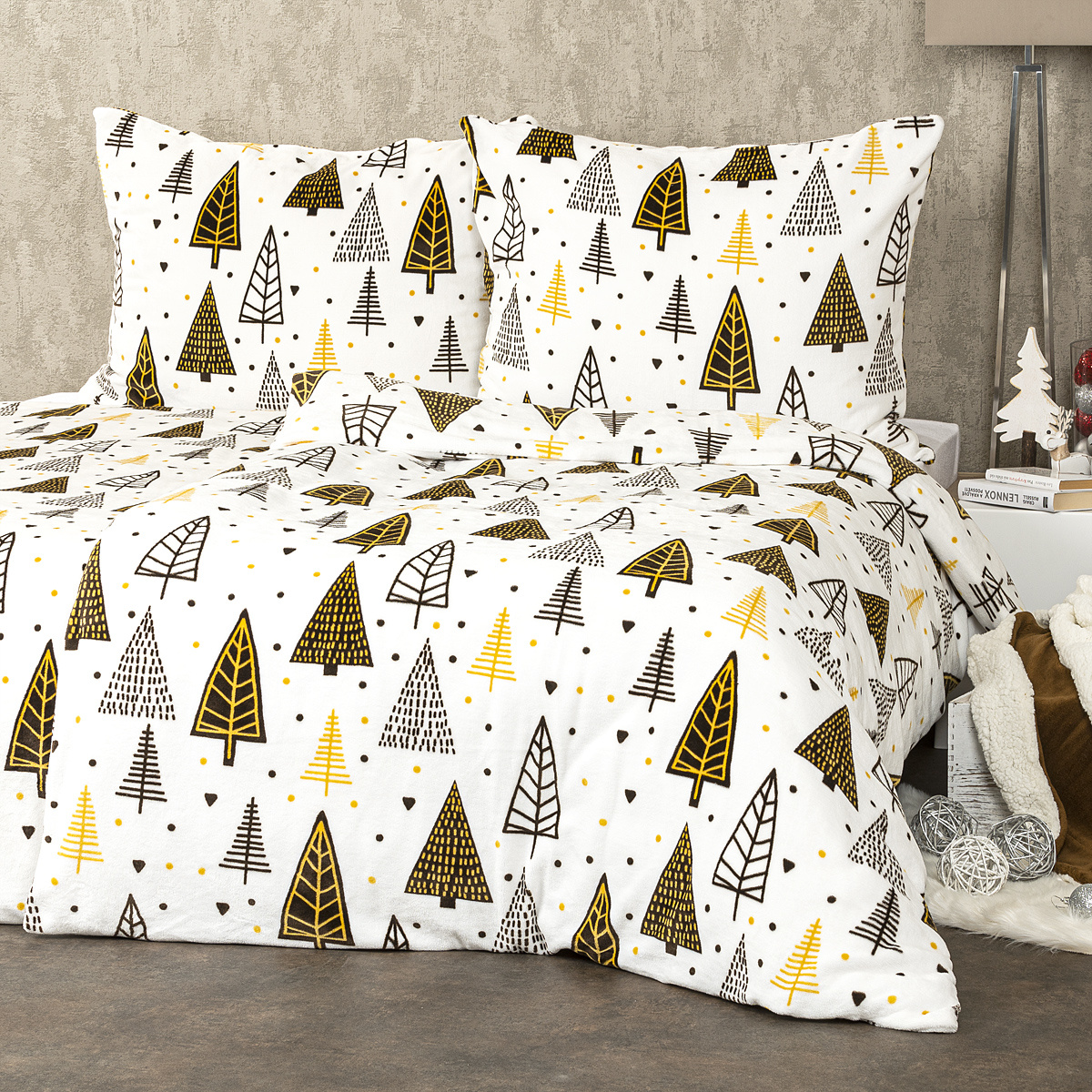 Kouzelné ticho zimního lesa si nyní můžete vychutnat i ve své ložnici. Mikroflanelové povlečení s jednoduchým zimním motivem ve skandinávském designu bude skvělým společníkem do chladných nocí. Hnědo-žluté stromečky na bílém podkladu navodí kouzlo zasněžených plání a vy usnete dřív, než první sněhová vločka dopadne na zem. Navíc je tak jemné a hřejivé, že si chladné zimní noci budete doslova užívat. Mikroflanel rychle schne, nemusí se žehlit ani se nemačká a je šetrný i k citlivé pokožce.Poznejte kouzlo kolekce bytového textilu Nordic, která osobitým způsobem čerpá inspiraci z oblíbeného skandinávského designu a dodá vašemu domovu harmonii severského bydlení. Kolekce Nordic nabízí pro každého něco: jemné pastelové barvy, neutrální barevné ladění, přírodní a zvířecí motivy či tradiční folklórní vzory.Souprava obsahuje: 1x povlak na polštář 70 x 90 cm 1x povlak na přikrývku 140 x 220 cm