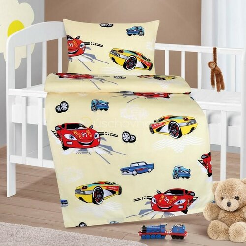 Bellatex Dětské bavlněné povlečení do postýlky Agáta Závodní auta žlutá, 90 x 135 cm, 45 x 60 cm